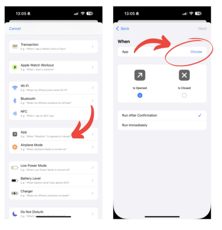 4. Tap App, then tap Choose. Make sure the Is Opened option is selected.