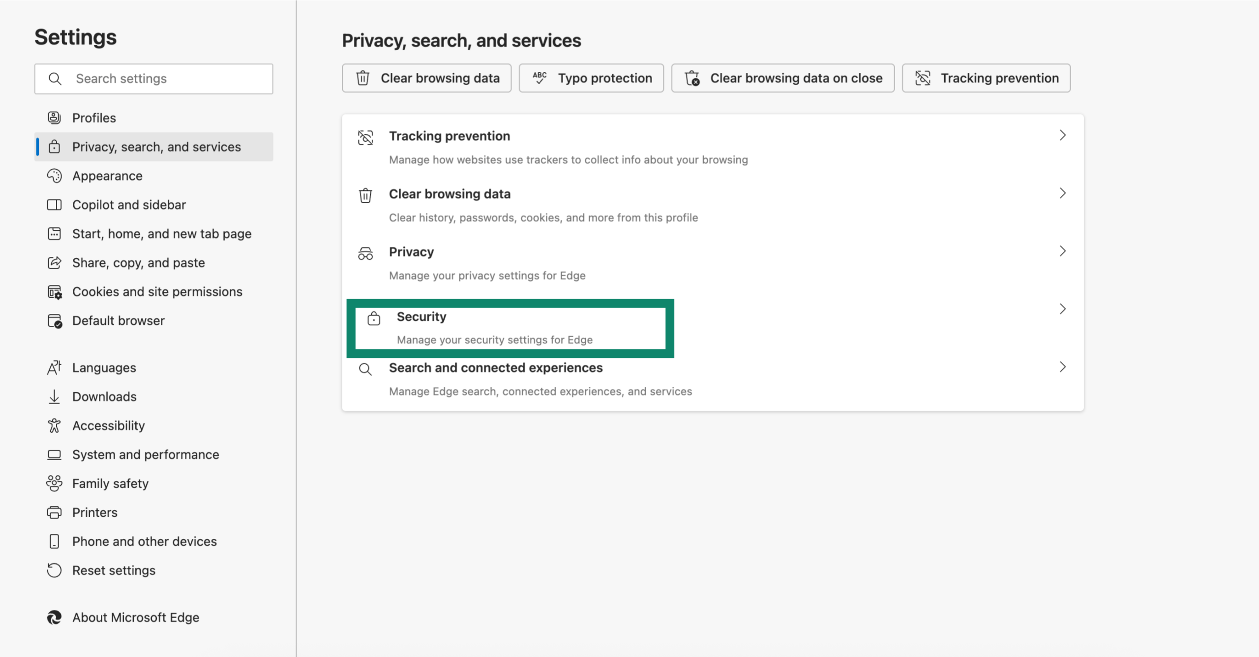 3. In the Settings page, choose Privacy, search, and services from the sidebar.Microsoft Edge settings Privacy search and services highlighted