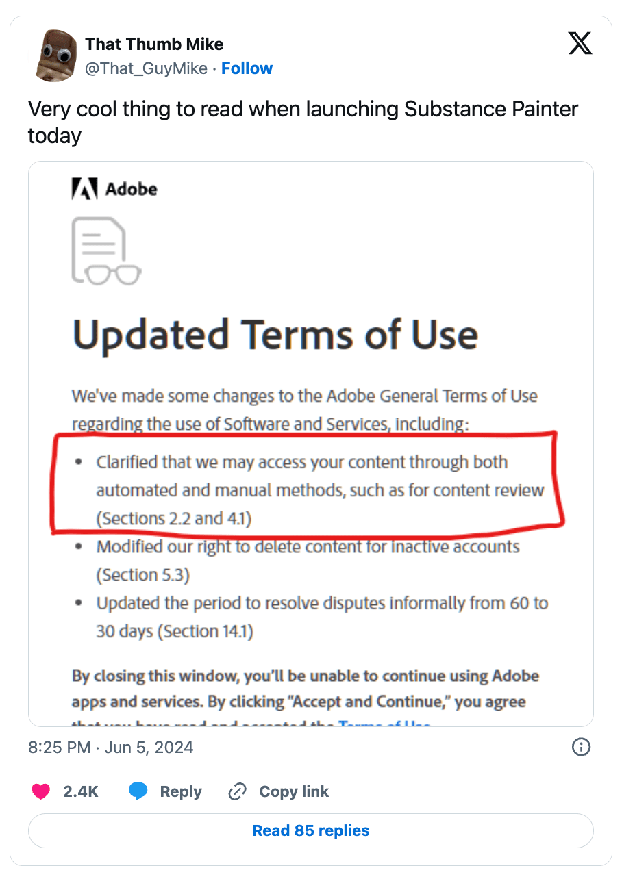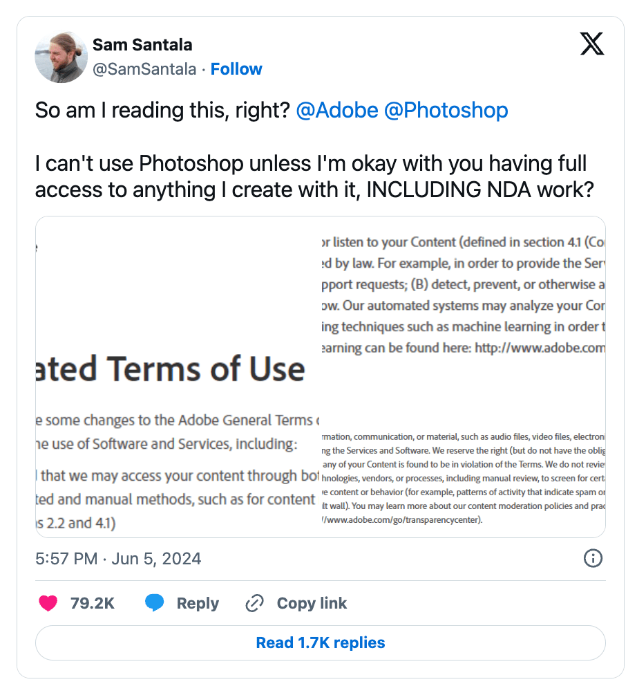In addition to Meta’s AI training controversy, Adobe recently faced similar backlash over recent updates to its Terms of Service. The uproar began when Adobe users misinterpreted the new language, fearing that their unpublished work could be used to train Adobe's AI models, including its Firefly AI.