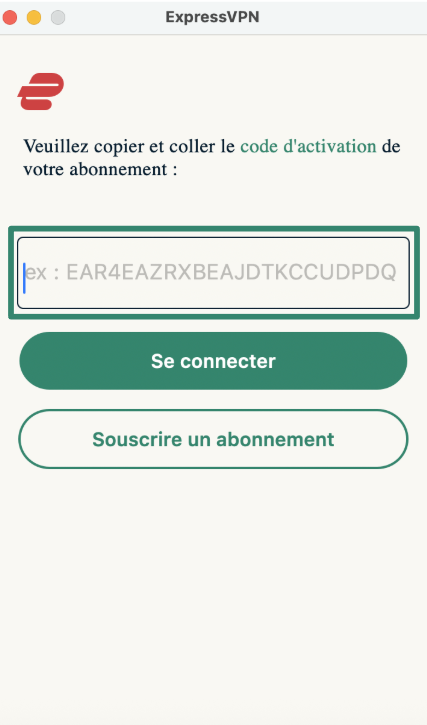 - Entrez votre code d’activation pour vous connecter à ExpressVPN. Vous trouverez le code dans votre tableau de bord ExpressVPN quand vous vous connectez au portail web.