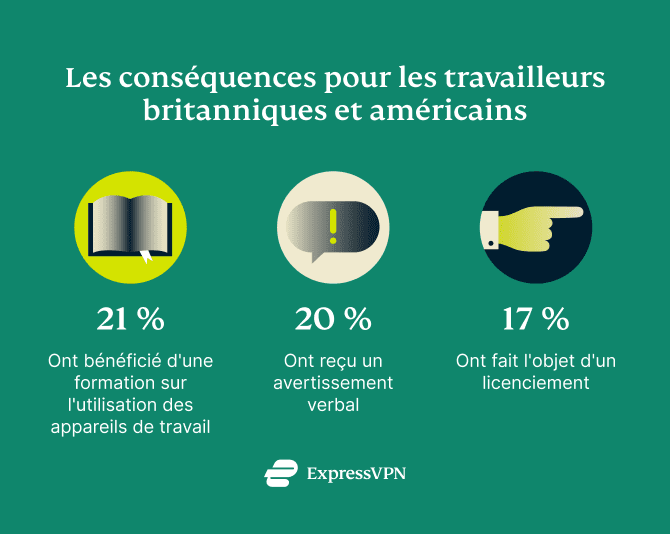 Parmi les personnes interrogées, 21 % ont déclaré que la principale conséquence de l'utilisation des appareils de leurs entreprises à des fins non professionnelles était l'obligation de suivre des cours de formation sur la manière d'utiliser correctement les appareils professionnels. Par ailleurs, 20 % des personnes interrogées ont déclaré avoir reçu un avertissement verbal et 17 % ont été licenciées à la suite de l'utilisation de ces appareils à des fins non professionnelles.