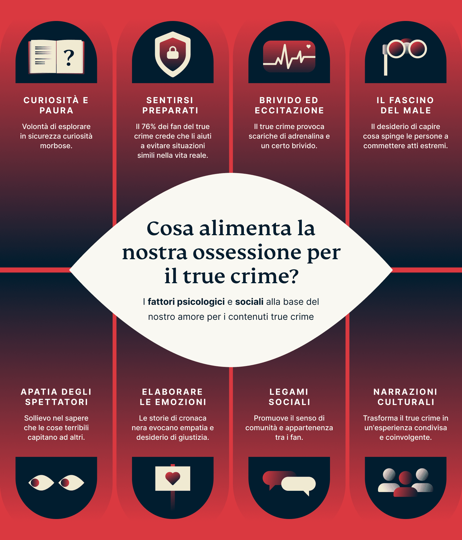 Dai podcast alle docuserie, è chiaro che la nostra ossessione per i fatti di cronaca nera trascenda i confini e sfidi le varie culture, unendoci in un’unica grande curiosità condivisa per esseri umani spregevoli. Un recente studio di YouGov mostra che oltre il 50% degli americani apprezza i contenuti true crime, con il 35% che ne fruisce almeno una volta alla settimana. Ma cosa c'è in queste storie che ci cattura? Perché ci ritroviamo incollati allo schermo, incapaci di distogliere lo sguardo dal dramma che si sta svolgendo?
