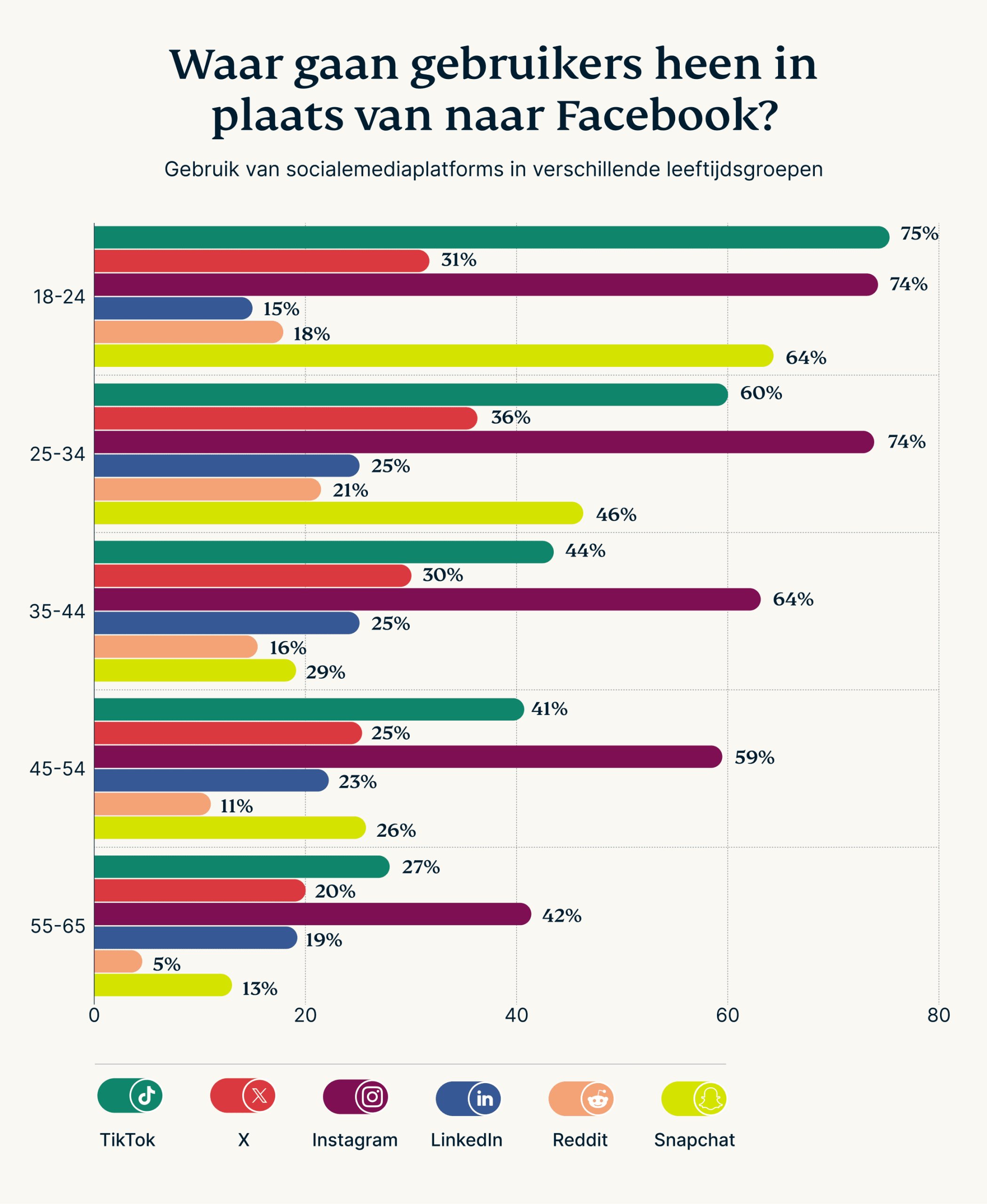 Voor Gen Z (18-24) staan platforms zoals TikTok en Instagram centraal. TikTok leidt met 75% van de Gen Z-gebruikers, terwijl 74% op Instagram actief is. Ook Snapchat blijft populair, met 64% van deze leeftijdsgroep die het gebruikt voor snelle, informele interacties.