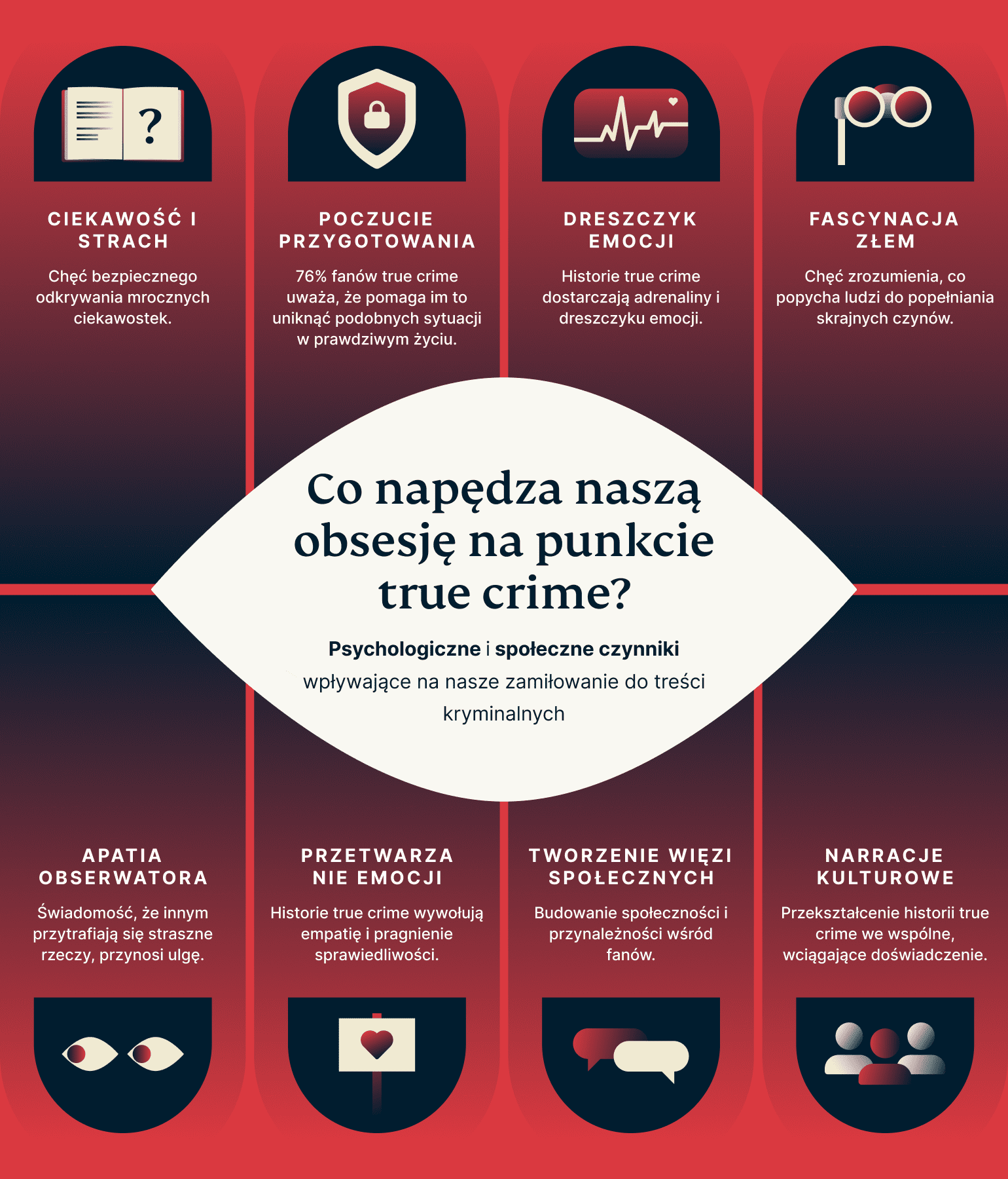 - Czynniki psychologiczne, takie jak ciekawość, zarządzanie strachem i poszukiwanie dreszczyku emocji, napędzają naszą obsesję na punkcie true crime.