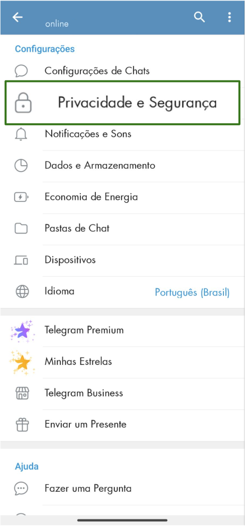 1. Abra o app do Telegram e acesse as Configurações. No Android, clique nas três barras horizontais no canto superior direito; no iOS, clique na opção Configurações.
