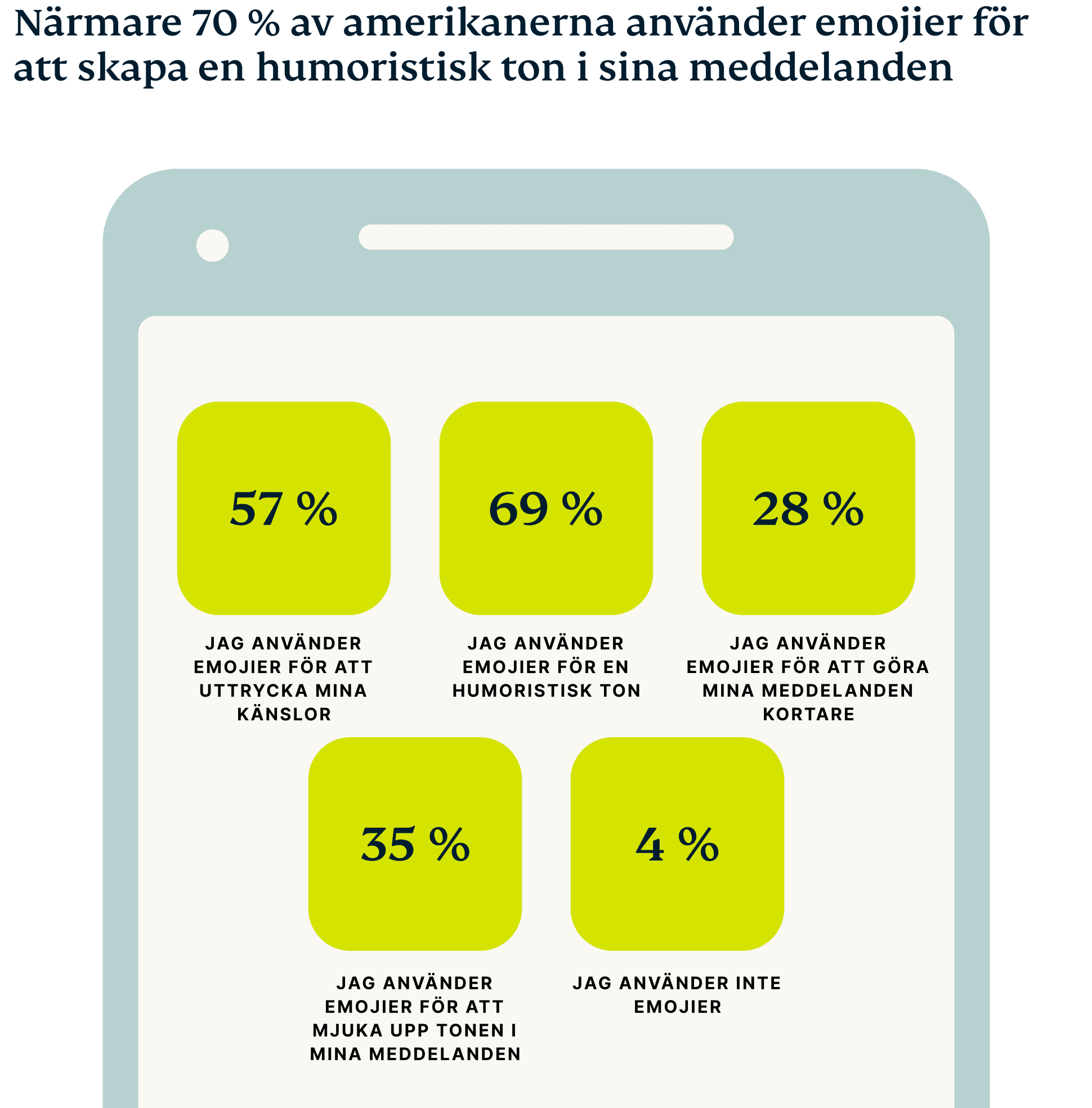 Människan är ett vanedjur och det gäller även när vi använder emojier. Enligt vår undersökning använder 70 % emojier när de interagerar med familj, vänner och kollegor. Samma grupp tenderar att förlita sig på ett fåtal emojier i sin kommunikation.