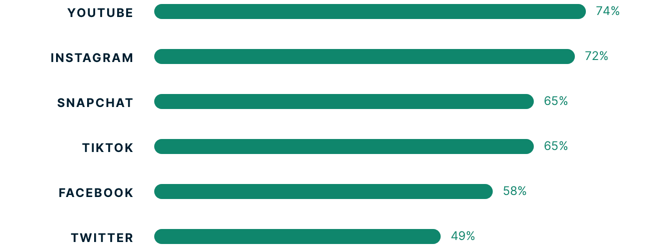 Sociala medieplattformar med fokus på videoinnehåll som TikTok och YouTube har högst användningstider bland Gen Z, där 45 % respektive 52 % säger att de använder plattformen i minst en timme varje dag. 14 % av de tillfrågade sa till och med att de tillbringar mer än fem timmar om dagen på YouTube, och ytterligare 11 % sa att de tillbringar med än fem timmar om dagen på TikTok.