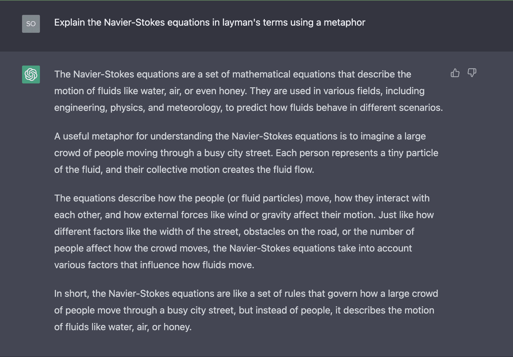 Analogien und Metaphern können wirkungsvolle Mittel für die Entwicklung neuer Ideen und das Verständnis schwieriger und komplexer Themen sein. Sie können auch hilfreich sein, um das vorliegende Thema aus einem neuen Blickwinkel zu betrachten. Wenn Sie beispielsweise über ein komplexes mathematisches Konzept schreiben, sich jedoch schwertun, dieses vollständig zu erfassen, könnten Sie ChatGPT bitten, eine Metapher bereitzustellen, die für ein besseres Verständnis sorgt.