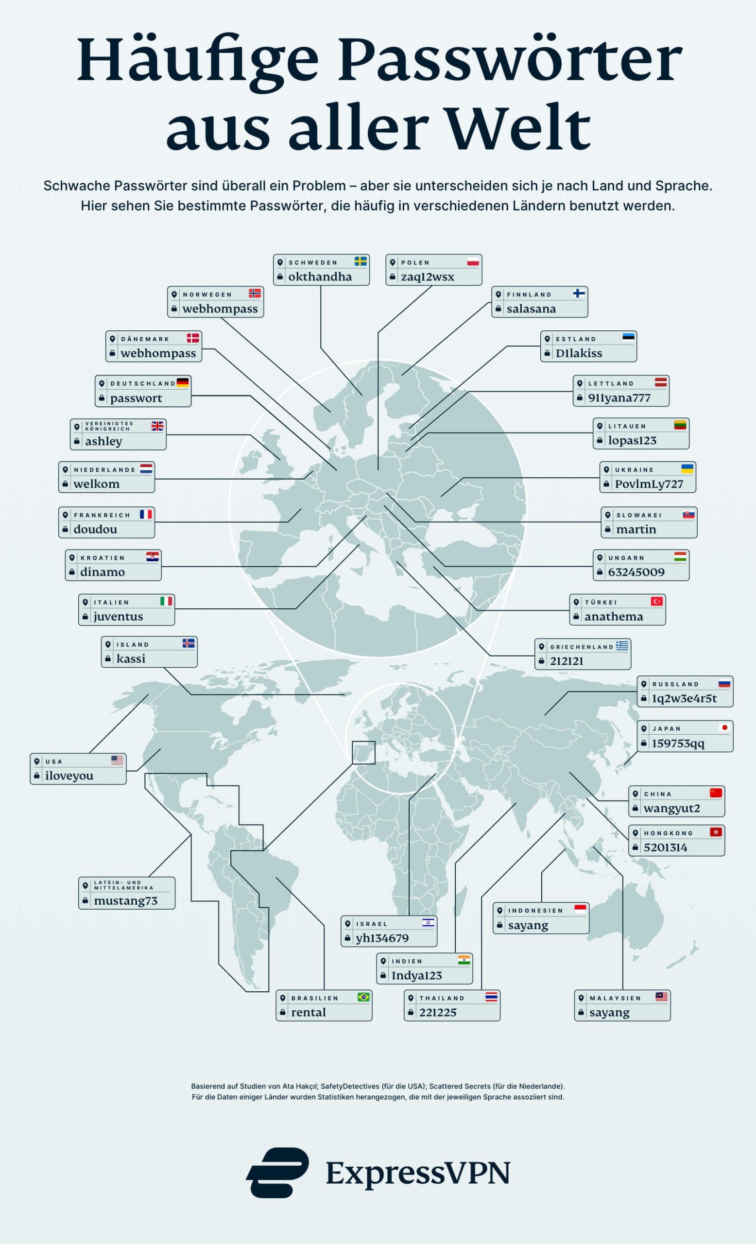 "123456" ist in den meisten Ländern der Welt das am häufigsten verwendete Passwort. Wenn Sie die häufig verwendeten Kennwörter jedoch nach Land oder Sprache sortieren, erhalten Sie ganz andere Ergebnisse.
