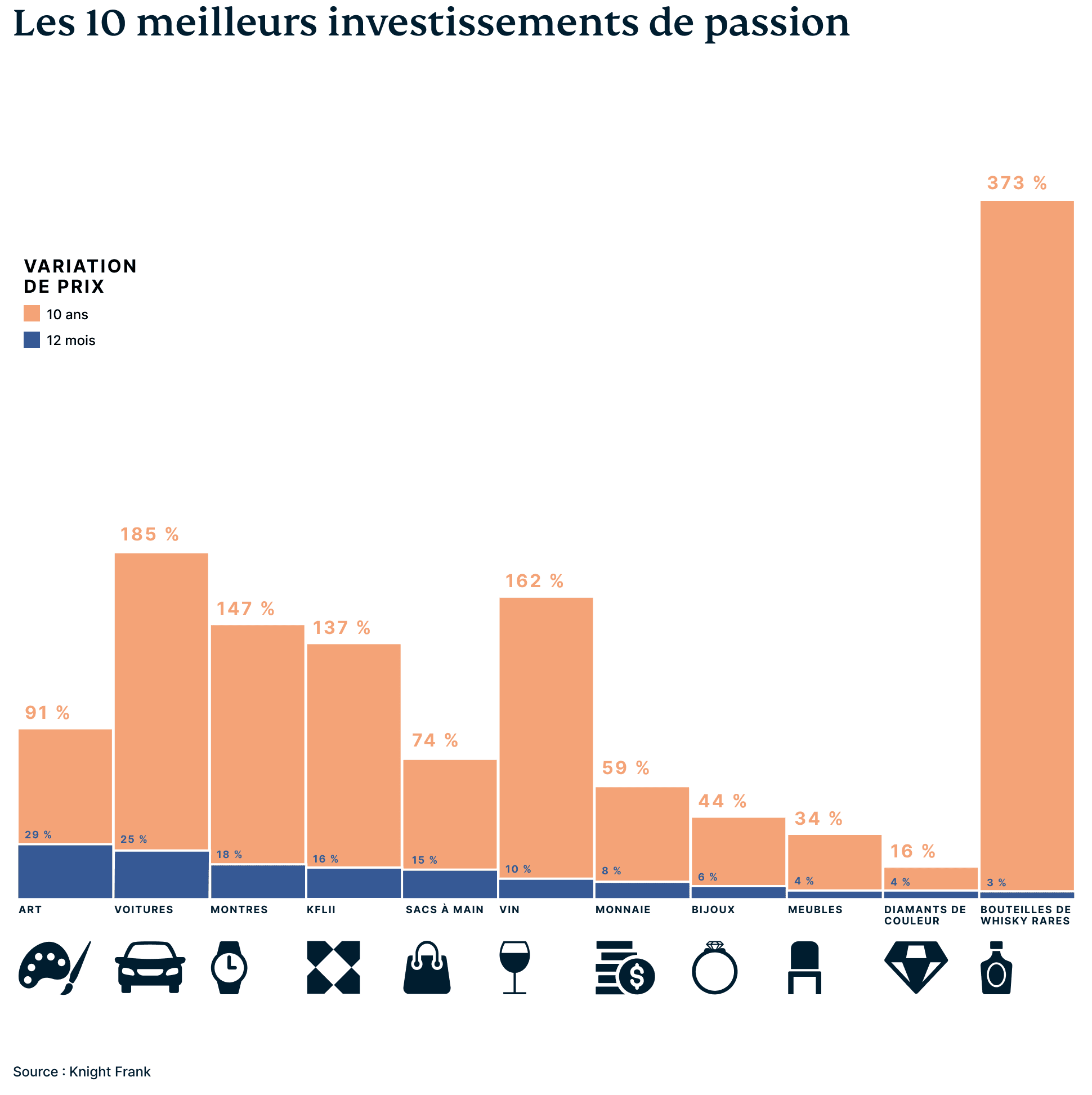 - Les investissements de passion comme le whisky rare, les beaux-arts, les objets de luxe et les voitures sont relativement stables par rapport au bitcoin et offrent des rendements élevés.