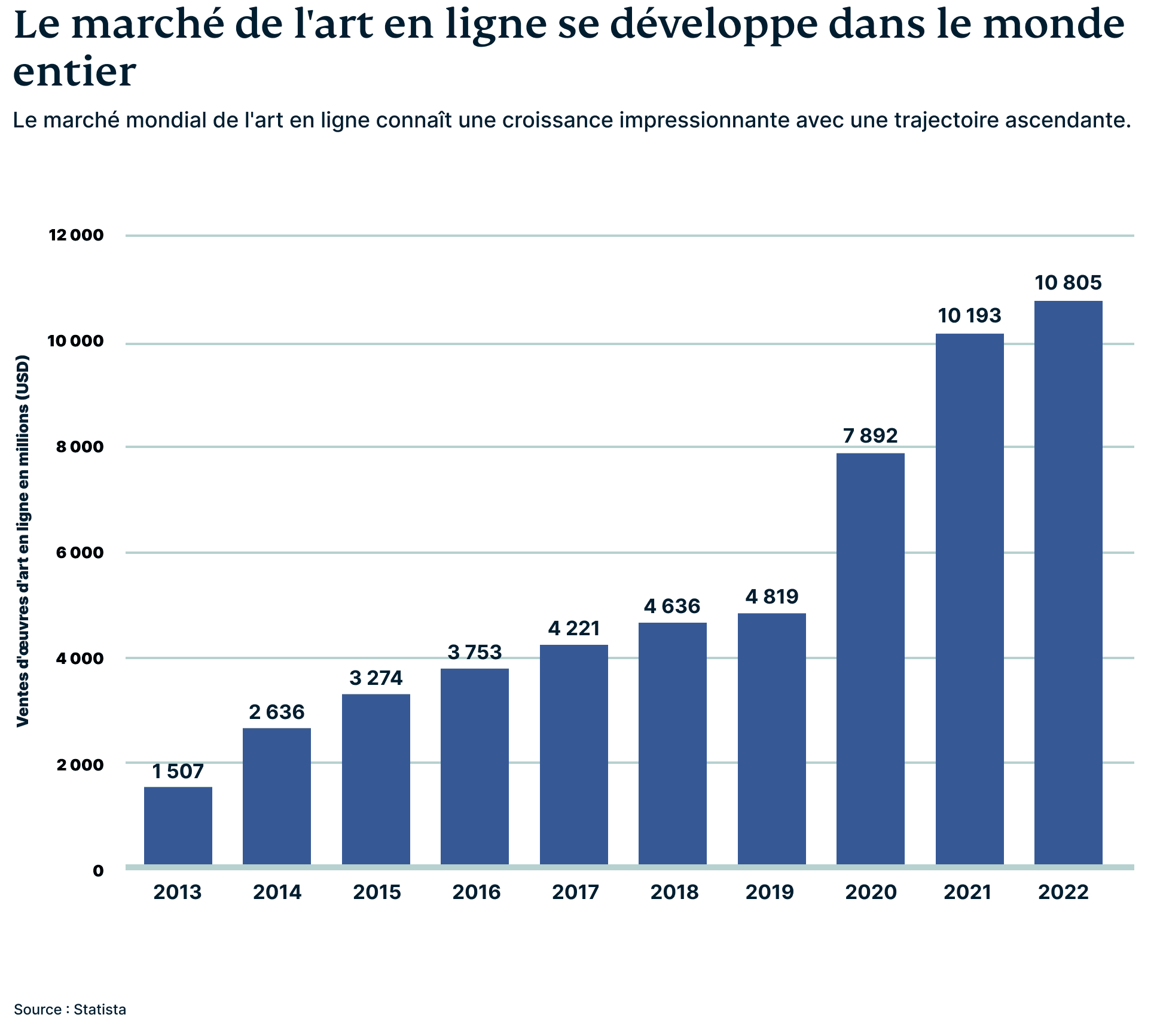 Investir dans les beaux-arts peut également être un moyen rentable qui vous permettra de diversifier votre patrimoine et de générer des revenus élevés. Rien qu'en 2022, les œuvres d'art ont devancé les autres catégories d'investissement de passion, affichant une hausse exceptionnelle de 29 %. En 2022, la vente d'œuvres d'art a généré un montant de 10,8 milliards USD en ligne.