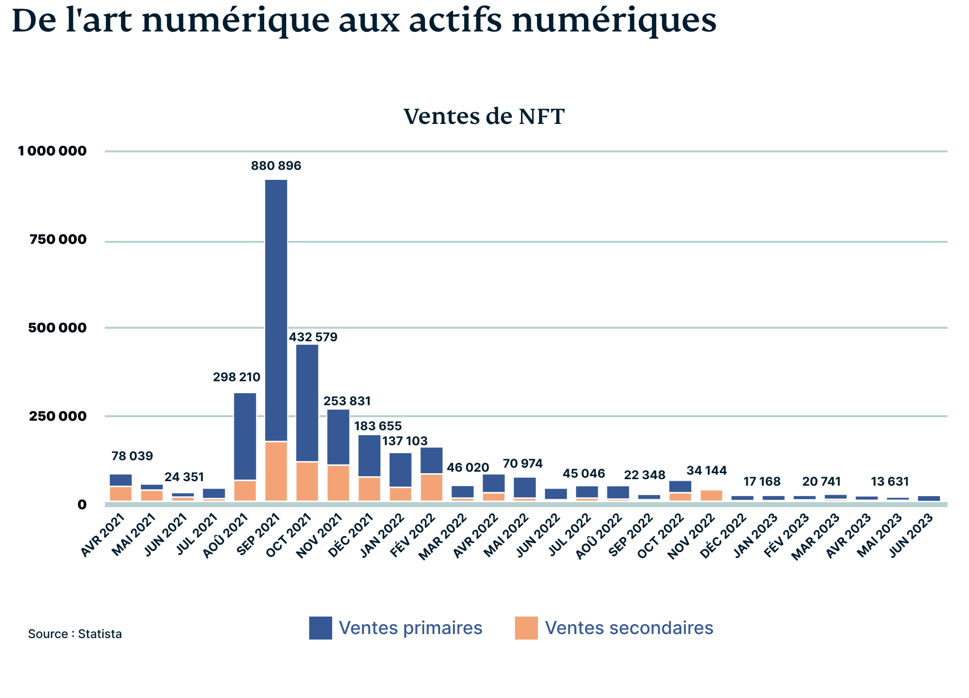Plusieurs facteurs ont contribué au déclin du marché des NFT. L'un d'entre eux est le manque d'engouement pour ce type d'investissement. Cela a conduit de nombreuses personnes à adopter une attitude plus sceptique à l'égard de cette technologie. Le graphique ci-dessous illustre la tendance ascendante des ventes de NFT entre avril 2021 et juin 2023.