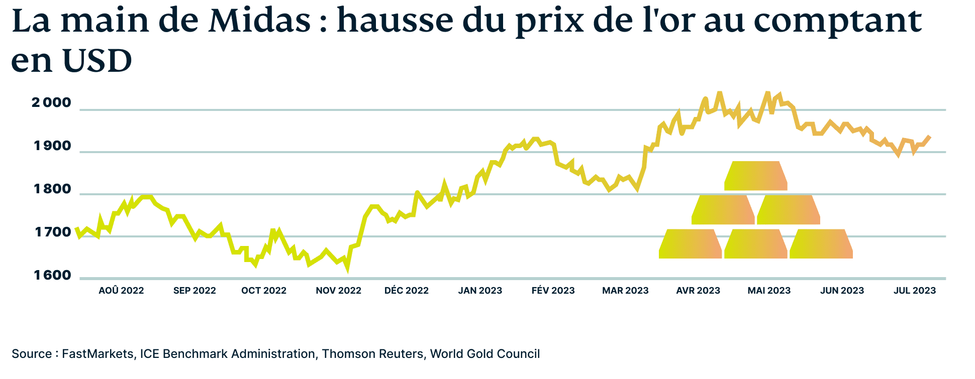 Selon Barron's, une revue financière, le prix de l'or a dépassé les 2 000 USD par once en avril 2023, atteignant ainsi la deuxième valeur la plus élevée de l'histoire. On note que des facteurs tels que la chute du dollar américain, la baisse des rendements obligataires et l'éventualité d'une récession économique sont à l'origine de l'intérêt accru pour l'or.