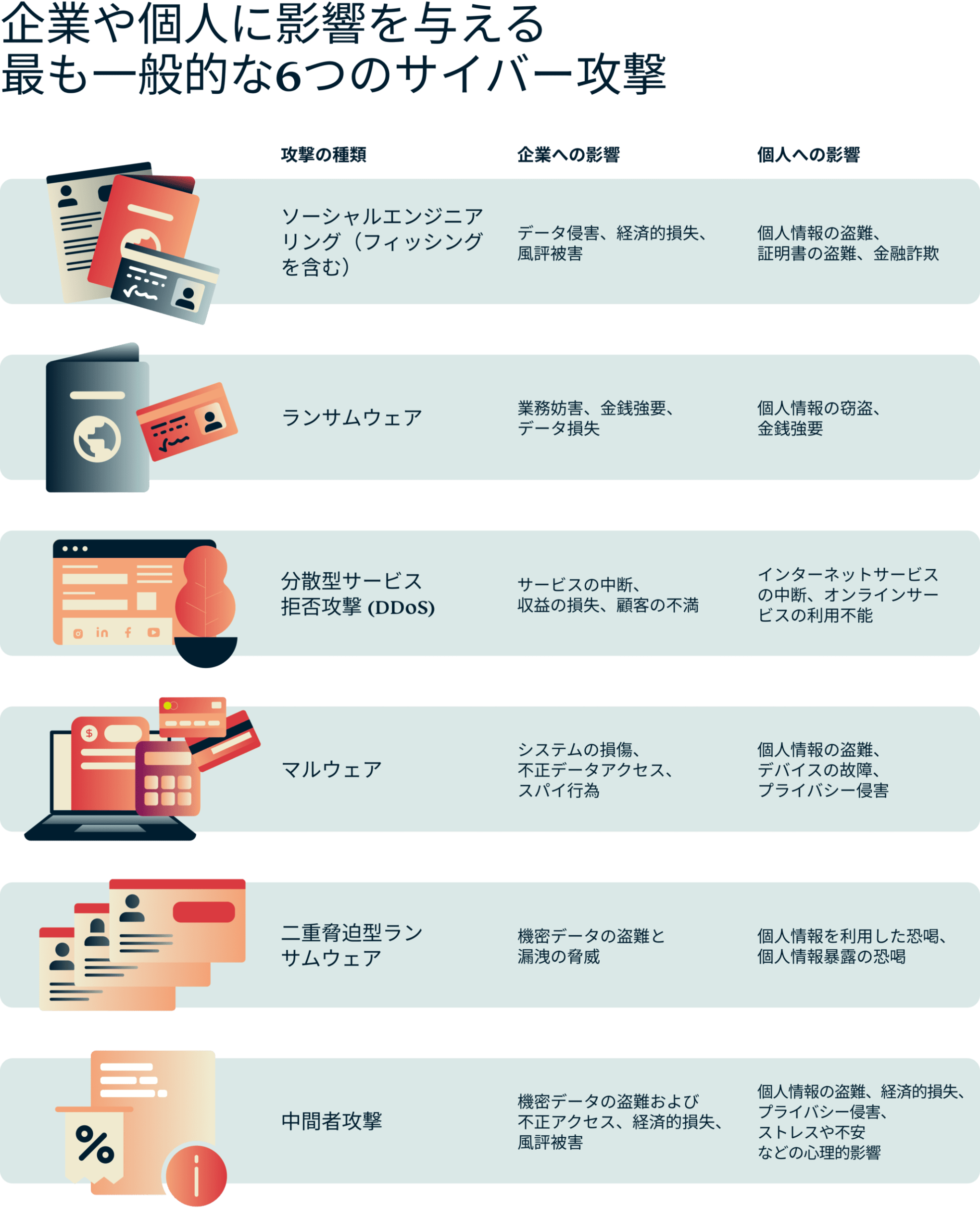 サイバー攻撃に対抗するためには、サイバー攻撃が様々な業界や個人に与える影響を理解することが重要です。ここでは、最も一般的なサイバー攻撃の手口、その実行方法、企業や個人への影響について掘り下げます。