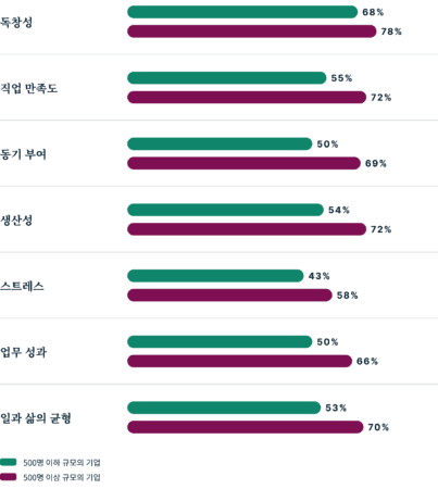 하이브리드 및 원격 근무 환경에서는 직원이 생산성을 유지하고 근무지와 연결되도록 하는 기술에 크게 의존하게 됩니다. 직원과 고용주 모두 기술 발전이 생산성을 높이고 동료들과의 사이를 발전시켰다는데 동의합니다. 또한 직원과 고용주는 화상 회의가 직장에서의 연결성을 가장 크게 증진한다고 말합니다.