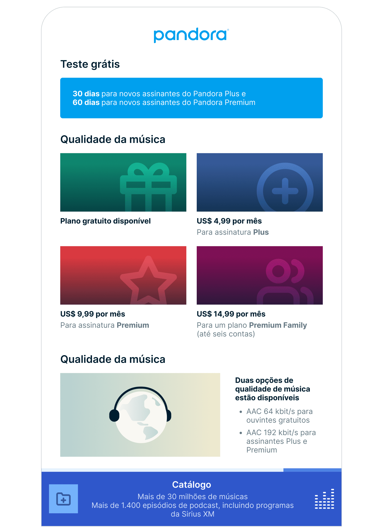 - Outras plataformas como Deezer, Tidal e Pandora têm ofertas e modelos de preços exclusivos, com foco na descoberta de músicas e áudio de alta qualidade.