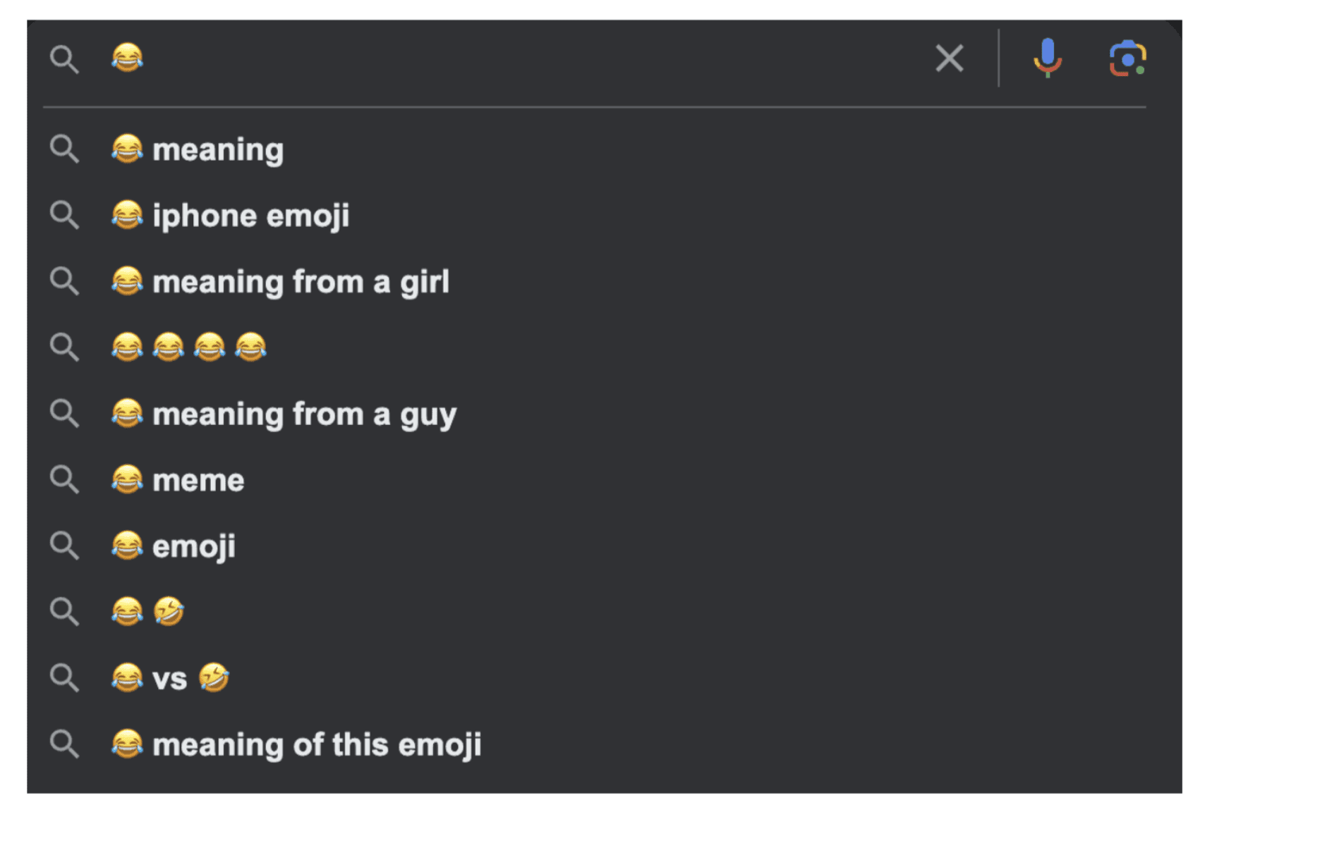 Emojiler, onları gören kişiye bağlı olarak, geniş bir yorum yelpazesine de sahip. Bu nedenle, gizli anlamlar taşıdıkları gibi yaygın bir inanç bulunuyor. Örneğin, 😂 emojisi için görünen arama önerileri şu şekilde: