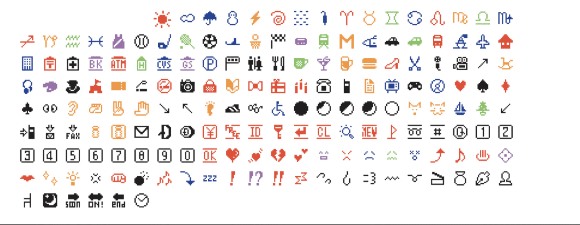 Yüz ifadeleri, DOCOMO adlı mobil operatörde çalışan Japon sanatçı Shigetaka Kurita’nın yolunu açarak 1999’da ilk 176 emojiyi oluşturmasını sağladı. İlk versiyonu (aşağıda) hava durumu, teknoloji ve günlük kullanılan aletlerle ilgili karakterler içeriyordu.