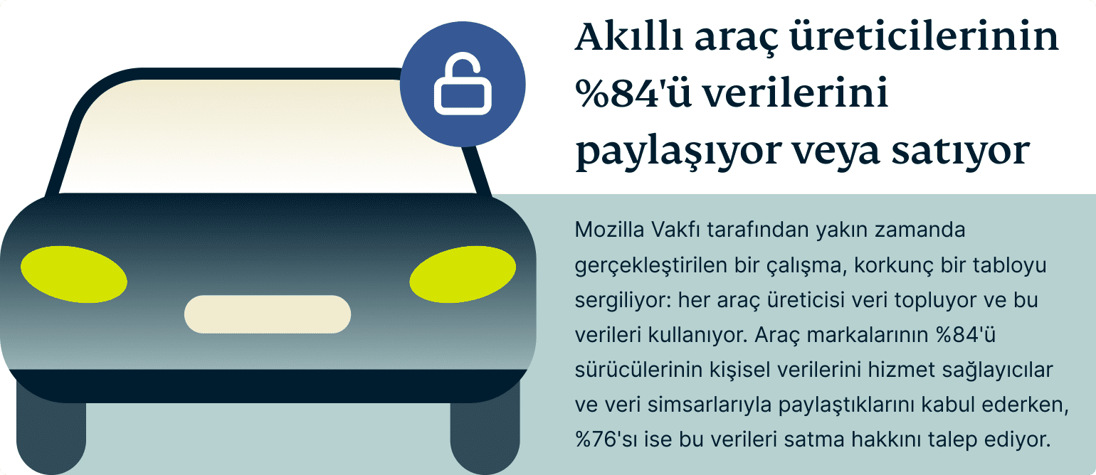 Akıllı araçlar devamlı olarak veri topluyor, bunları üreticilere kablosuz olarak iletiyor ve genellikle üçüncü taraf hizmet sağlayıcılarla paylaşıyor. Toplanan verilerin kapsamı dehşet verici: