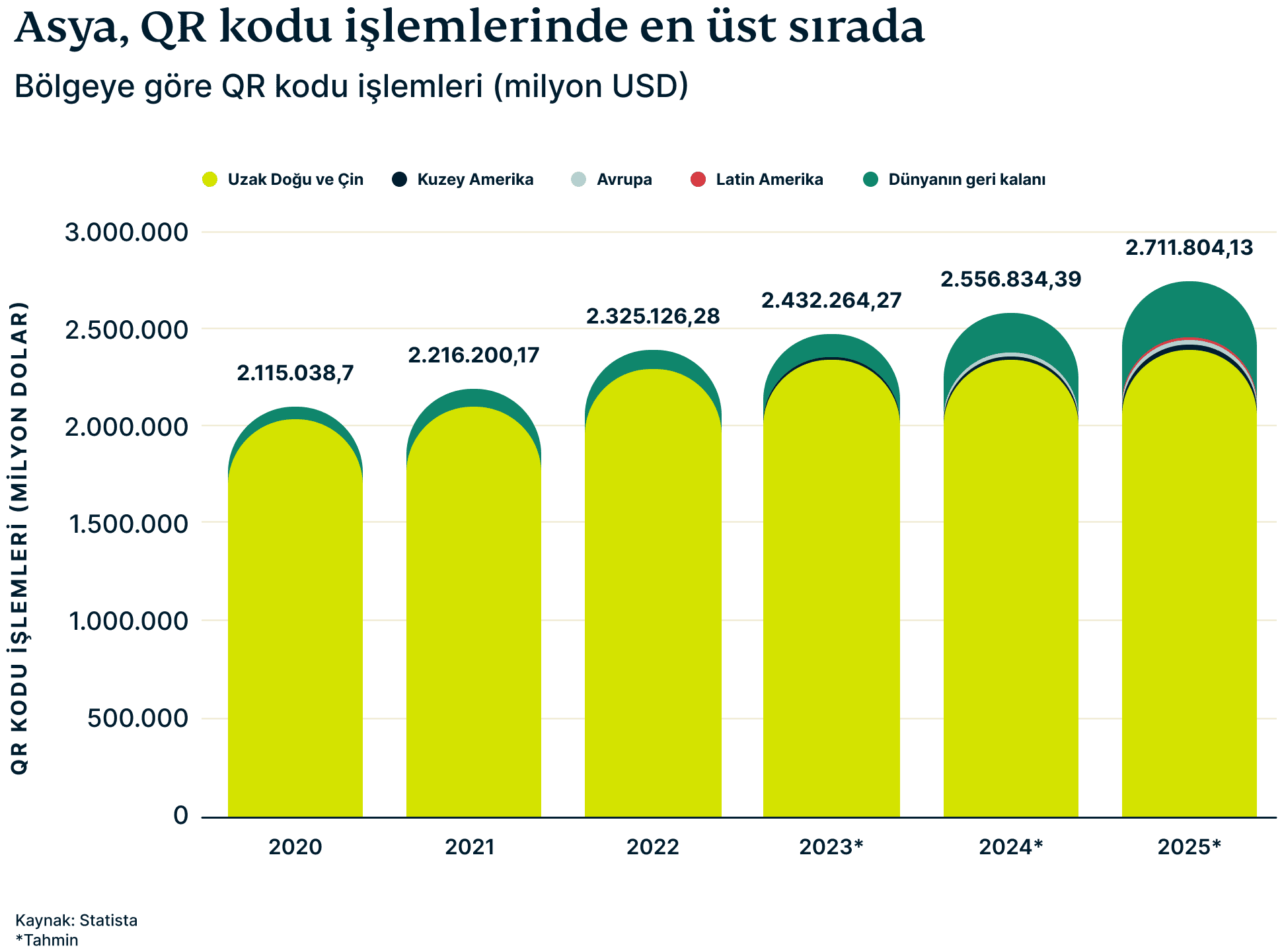 Statista’ya göre, bu bölgede yalnızca 2023’te QR kodu üzerinden 2.2 trilyon USD’den fazla bir tutarın işlem görmesi bekleniyor. Bunu, 15.4 milyar USD değerinde ürün ve hizmet için ödeme yapmak için QR kodlarını kullanması beklenen kullanıcılara sahip Kuzey Amerika ve QR kodlarını kullanarak 3.4 milyar USD transfer etmesi beklenen Latin Amerika takip ediyor.